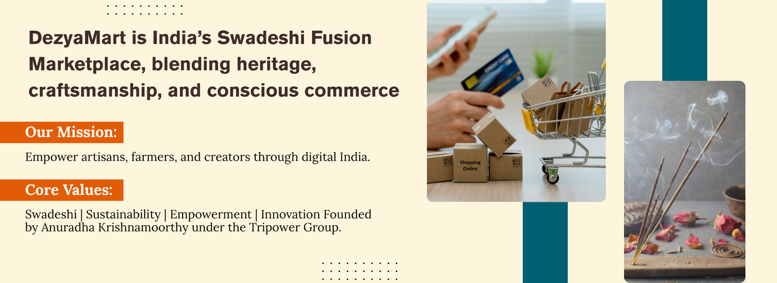 DezyaMart is India’s Swadeshi Fusion Marketplace, blending heritage, craftsmanship, and conscious commerce into a seamless shopping experience. It stands as a platform that celebrates India’s diverse traditions while empowering artisans, small businesses, and conscious brands to reach a wider audience. Rooted in authenticity and sustainability, DezyaMart promotes locally crafted products that reflect India’s cultural richness with a modern touch. Every product embodies a story of passion, purity, and purpose—supporting fair trade, ethical production, and environmental responsibility. Driven by values of integrity, empowerment, and inclusivity, With a focus on constant innovation, DezyaMart was founded by Anuradha Krishnamoorthy under the Tripower Group, symbolizing the vision of uniting tradition and technology to shape the future of conscious commerce.